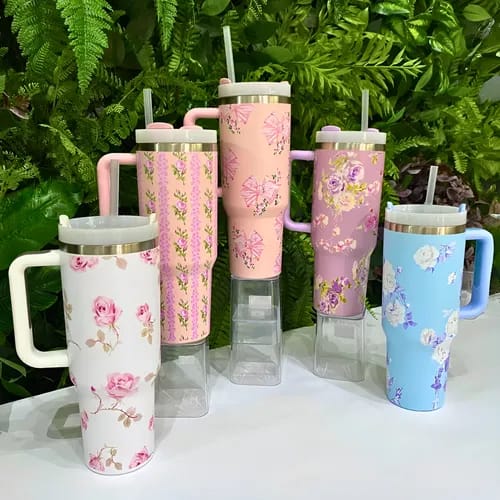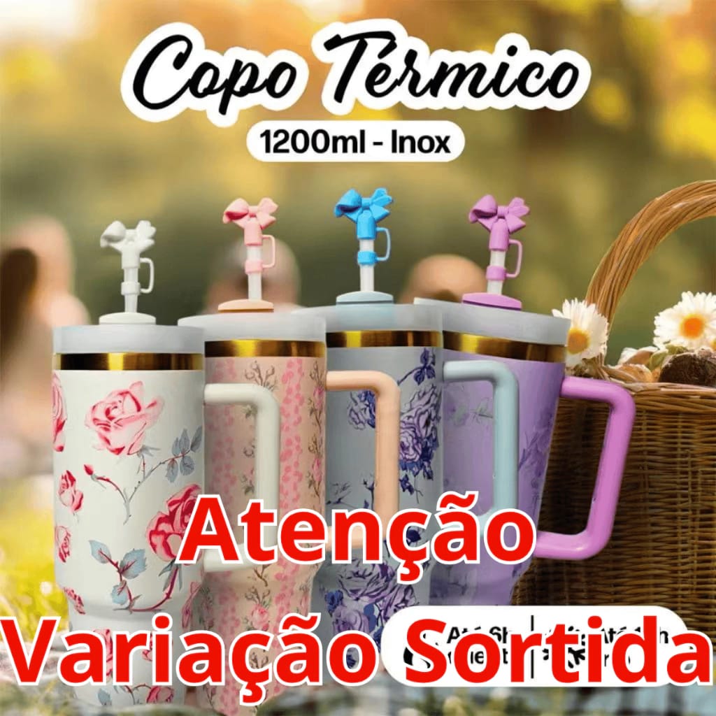 Copo Térmico Florido 1200ml Aço Inoxidável Com Canudo